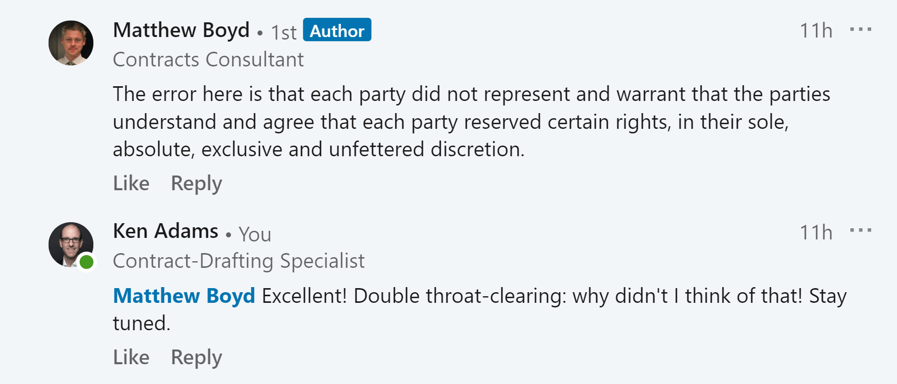 I mention this because of an exchange I had today with Matt Boyd on the LinkedIn group A Manual of Style for Contract Drafting. Here’s the pertinent extract: