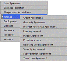 The Indexer reads a given Reference Set, classifies the constituent contracts by type, and breaks them down into their component clauses. The Indexer can analyze a Reference Set consisting of anything from a handful of contracts to hundreds. The contracts don’t have to be selected by hand, as the software efficiently allows you to weed out those contracts that are irrelevant for your purposes. Documents are classified by reference to a configurable taxonomy of document types, such as credit agreements, security agreements and promissory notes. The image to the right shows that part of a taxonomy for contracts related to finance.